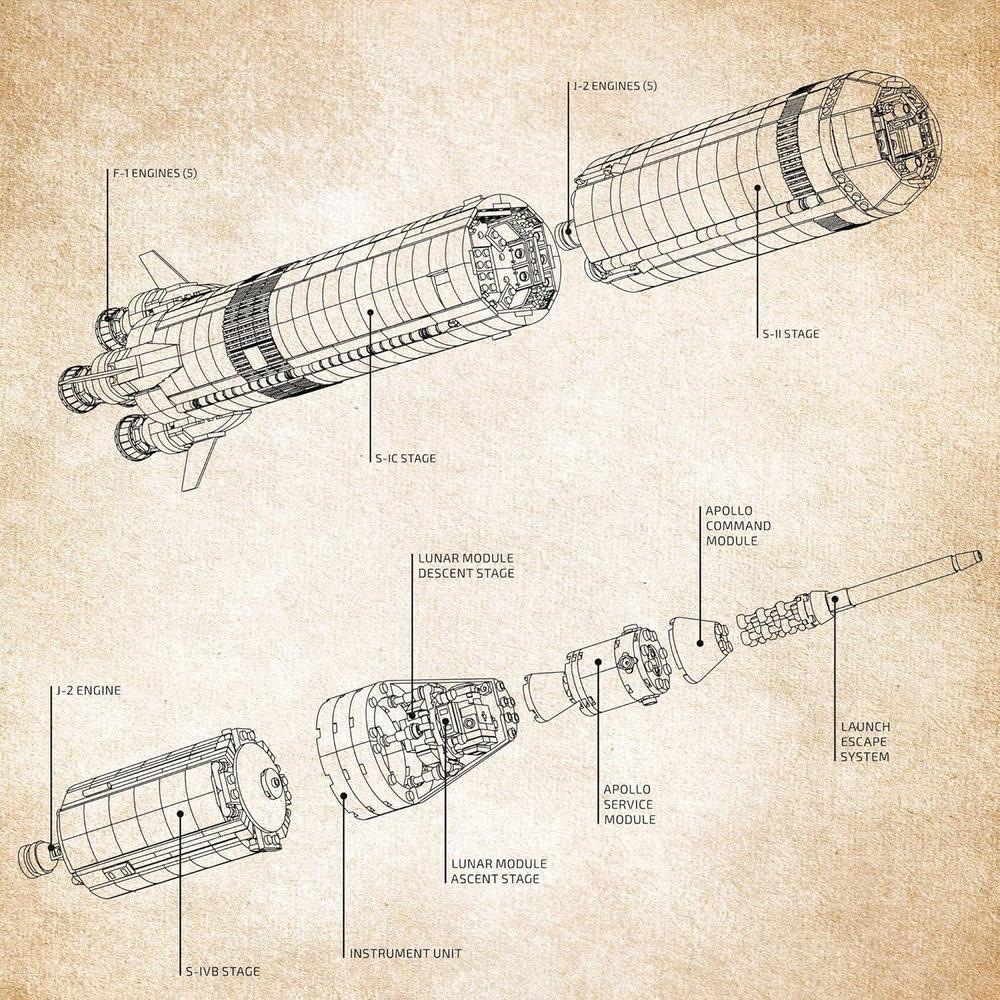 • Consta de cohetes conectados de 3 etapas, módulos de servicio y comando (CSM), una unidad que sostiene el módulo lunar en el interior y un sistema de escape de lanzamiento