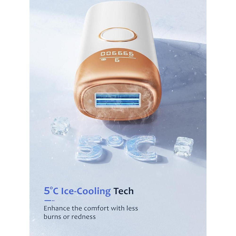 • ️ Tecnología Ice-Touch que enfría instantáneamente la piel a 41.0 °F/41℉ al contactar. La función integrada de compresa de hielo alivia la piel, reduce el enrojecimiento y minimiza las molestias durante el tratamiento, ofreciendo una cómoda experiencia de depilación en casa. Comprueba la tabla de tonos de piel incluida para asegurarte de que tu piel y color de cabello sean adecuados antes de usar.