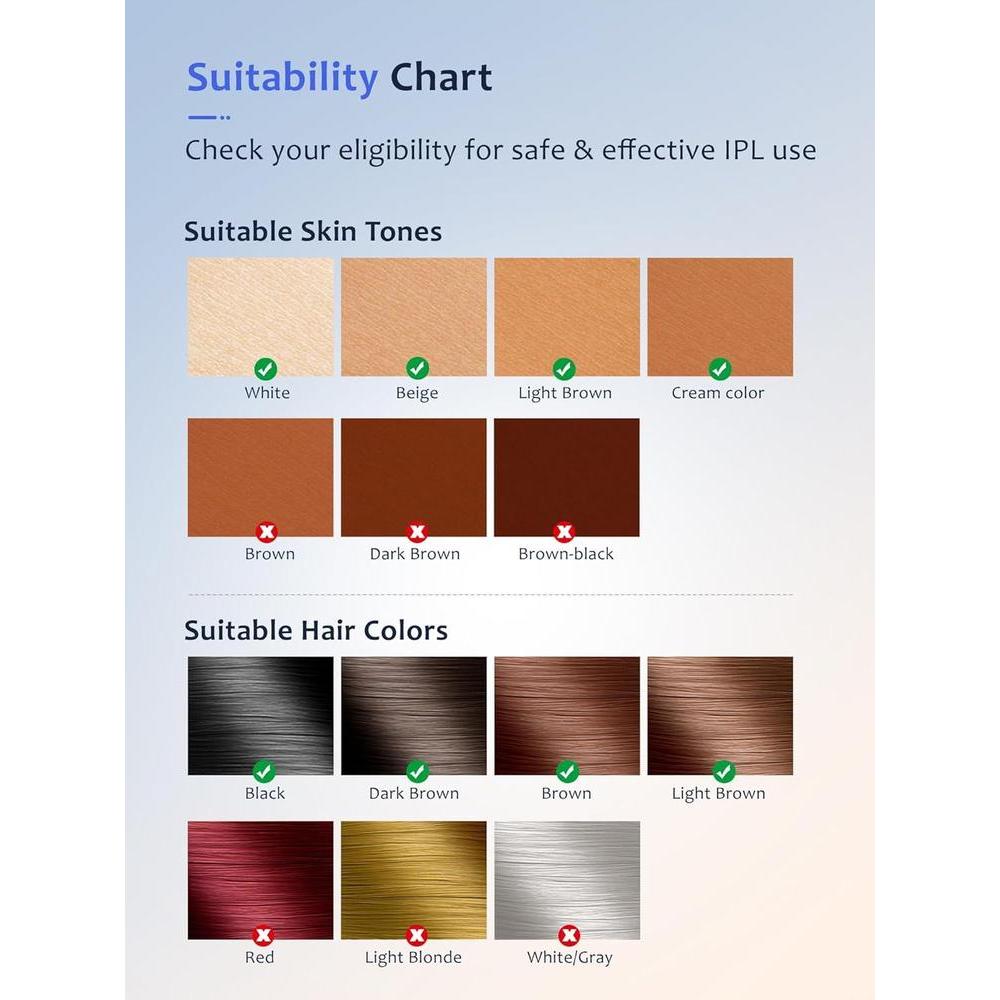 - ️ Comprueba si tu tono de piel y color de cabello son adecuados para este dispositivo. Consulta la tabla proporcionada o ponte en contacto con nuestro servicio de atención al cliente para obtener orientación. Contenido del paquete: dispositivo de depilación IPL, gafas, afeitadora, manual de usuario (idioma español no garantizado), si no estás satisfecho con el producto o nuestro servicio, ponte en contacto con nosotros inmediatamente.
