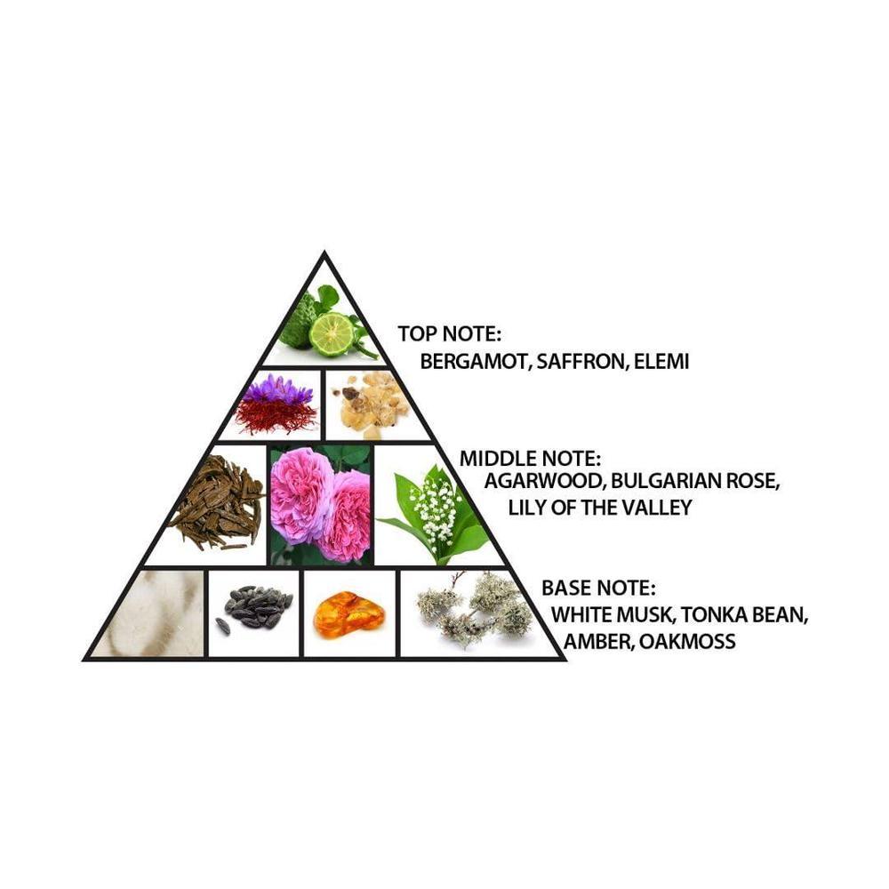 - Fragancia: Oud, Ámbar, Afrutado (Bergamota, Mandarina, Melón, Piña), Floral (grosella negra), Vainilla, Almizcle Oud, Ámbar, Afrutado (Bergamota, Mandarina, Melón, Piña), Floral (grosella negra), Vainilla, Almizcle