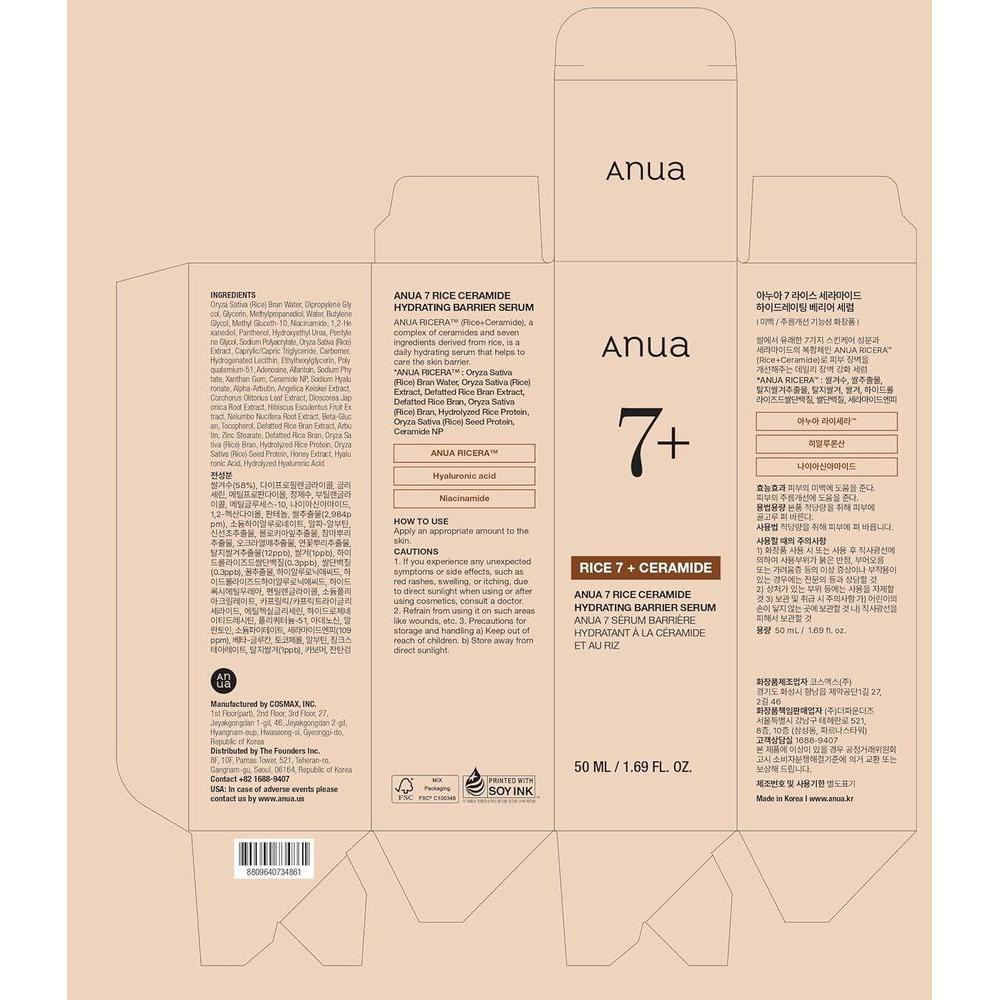 ANUA Suero Hidratante Facial Rice Ceramide 7 Con Ácido Hialurónico Y Niacinamida 50ml