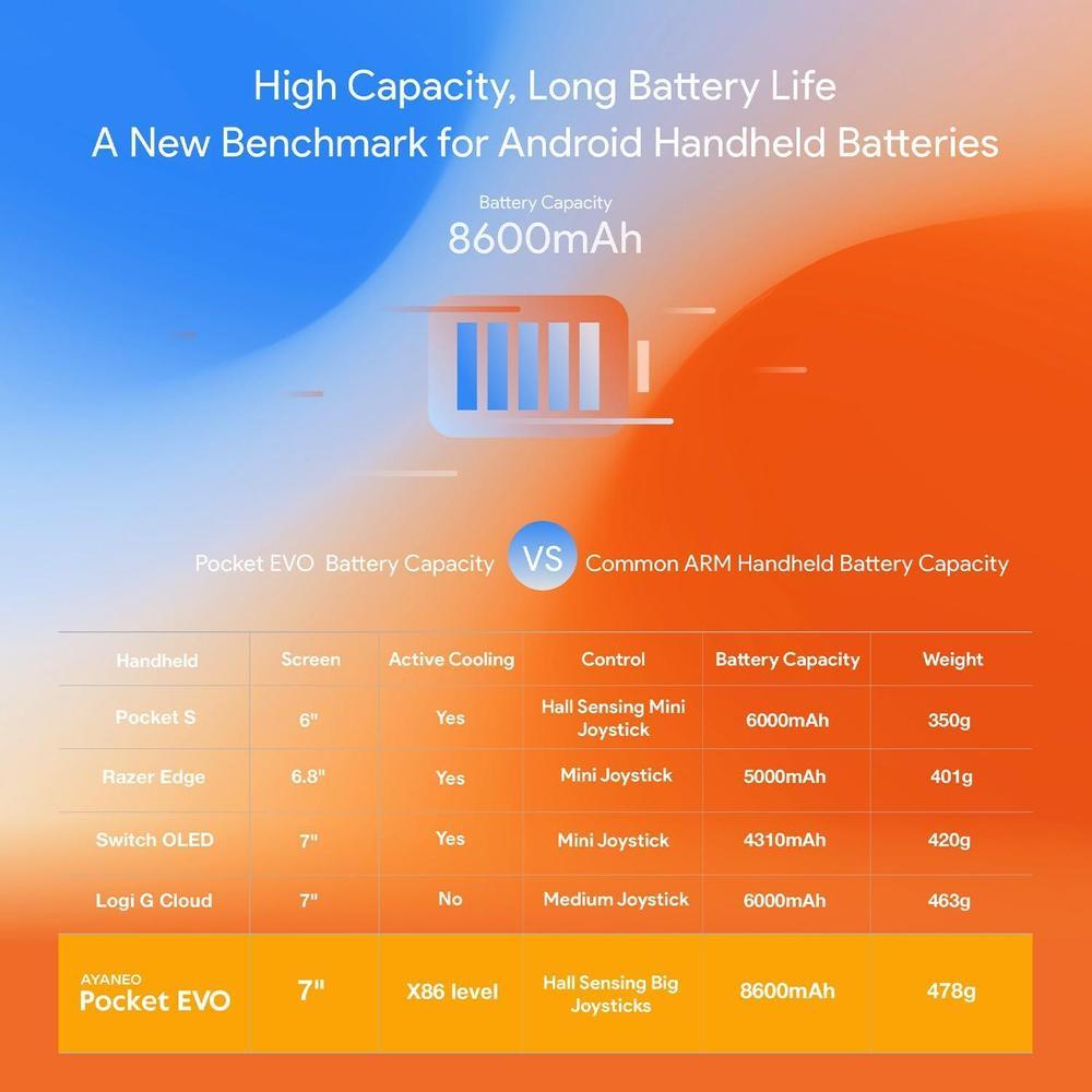• Duración prolongada de la batería: alimentado por una batería masiva de 8600 mAh con soporte de carga rápida PD, alojado dentro de un chasis premium de 16.86 oz (478.28 g) que mide 10.256 x 3.937 x 0.669 in (26.05 x 10 x 1.7 cm), con enfriamiento activo de nivel x86 con amplias aletas de disipación de calor para mantener un rendimiento óptimo durante sesiones de juego prolongadas.