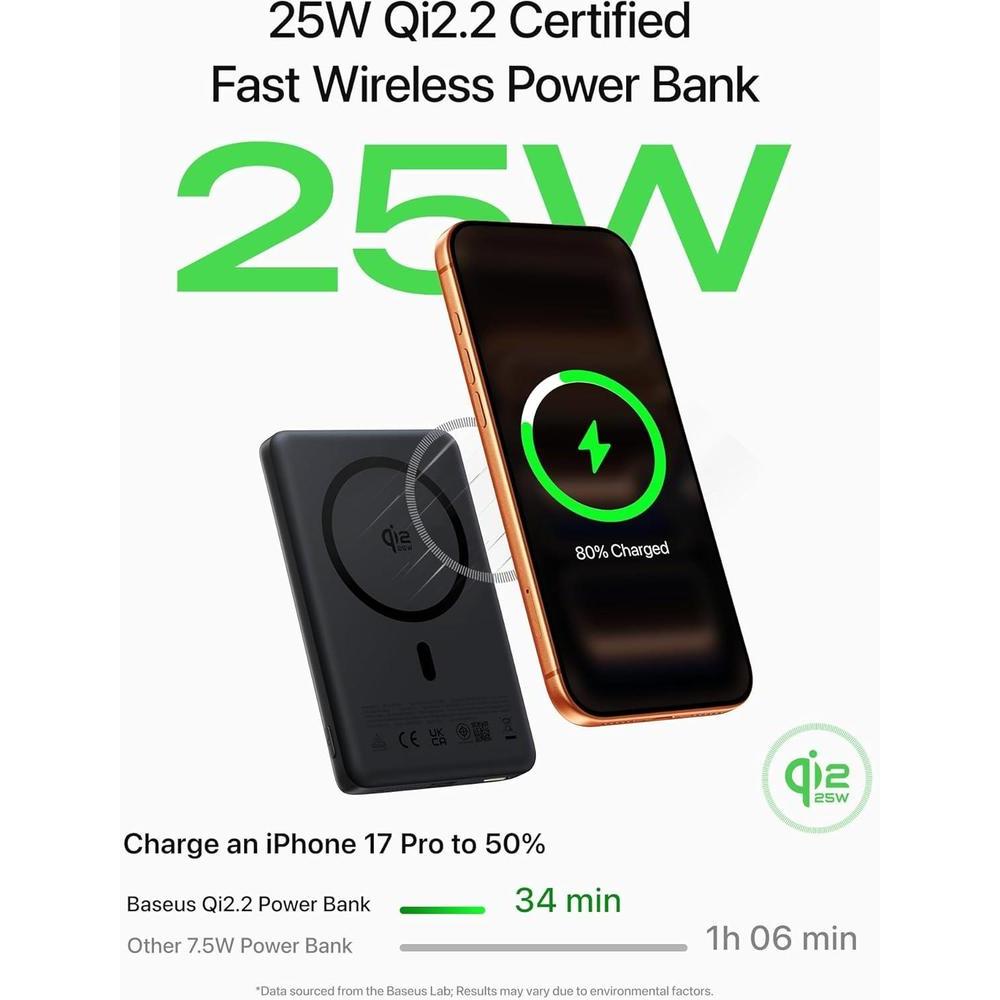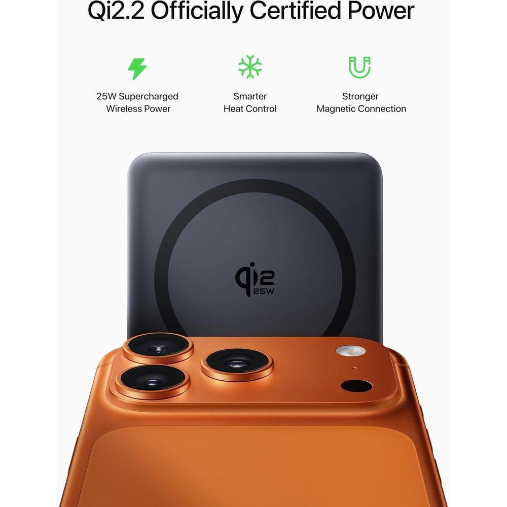 • Certificado Qi2.2 y carga inalámbrica ultrarrápida:Enciende tu dispositivo a alta velocidad con nuestra batería MagSafe certificada Qi2.2. Este banco de energía magnético ofrece una carga rápida inalámbrica estable de 25 W (25 W) para dispositivos compatibles con iPhone 17/16 y Qi2.2. Se enciende, carga al instante y pasa menos tiempo esperando, perfecto para viajes, viajes y vida diaria ocupada. (Nota: la serie iPhone 12-15 admite carga inalámbrica de hasta 15 W (15 W))