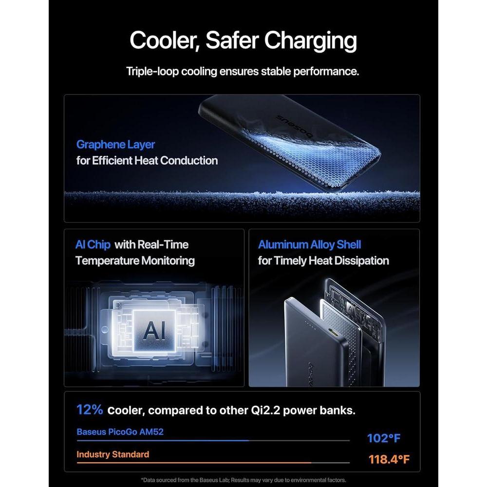 • Gestión avanzada del calor para una carga segura:este cargador portátil inalámbrico está diseñado para mayor durabilidad y uso prolongado. Cuenta con un chip de control de temperatura inteligente NTC para monitoreo del calor en tiempo real, junto con una capa interior de grafeno y una carcasa de aleación de aluminio para una disipación eficiente del calor. Esto garantiza que tus dispositivos se mantengan frescos y protegidos durante la carga a alta velocidad, ofreciendo una alternativa más segura a la batería de Apple.