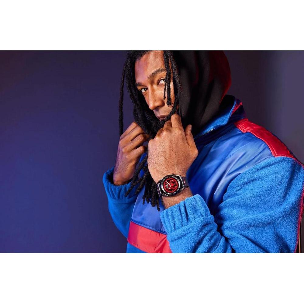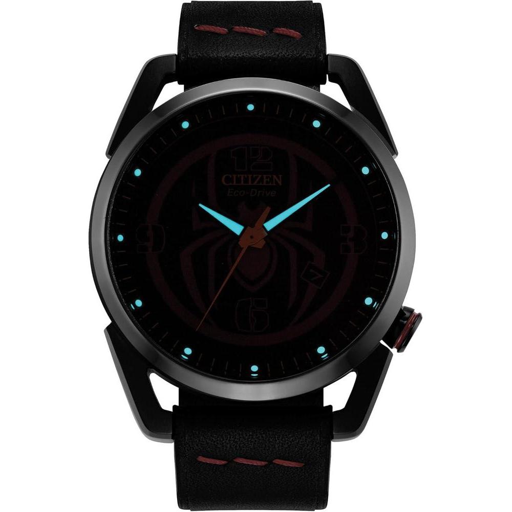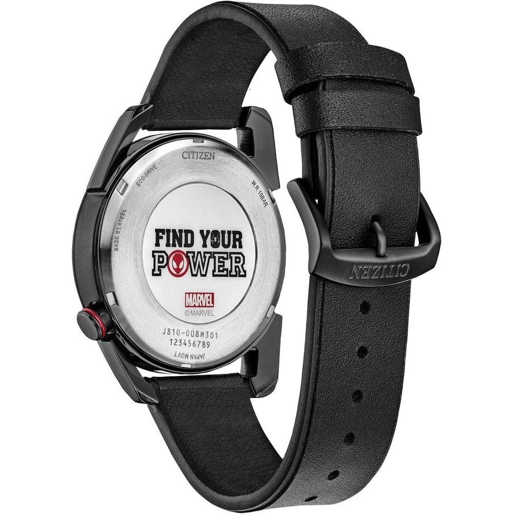 Citizen Reloj Eco-Drive Marvel Miles Morales acero inoxidable negro con correa cuero y esfera negra, modelo AW1685-00W