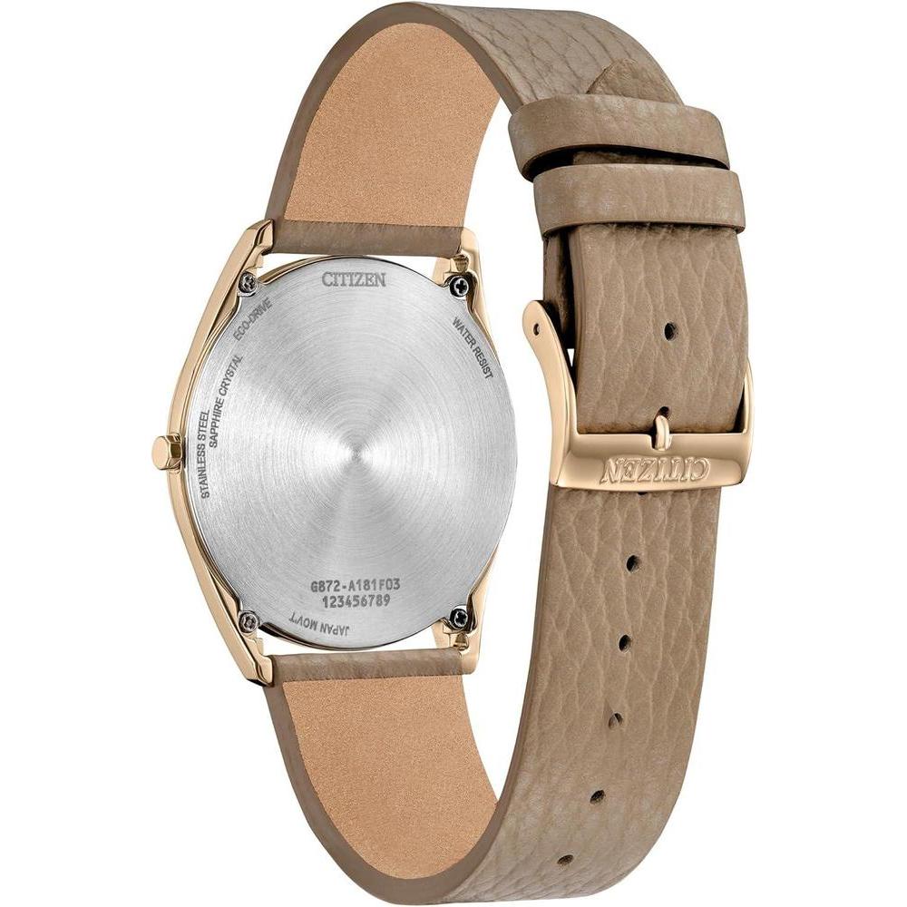 • La colección Citizen Suratto cuenta con una carcasa delgada notablemente definitoria de 4.7 mm (0.185 in), y funciona de forma sostenible con cualquier luz con tecnología Eco-Drive, que nunca necesita una batería.