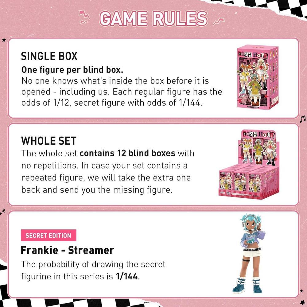 • POP MART Figuras de la serie Peach Riot Rush Hour: La caja ciega contiene una figura aleatoria de una serie específica. Cada caja ciega solo contiene una figura. Nadie, incluidos nosotros, sabe lo que hay dentro. Esta colección contiene 12 figuras de caja ciega, una de ellas podría ser la edición secreta.