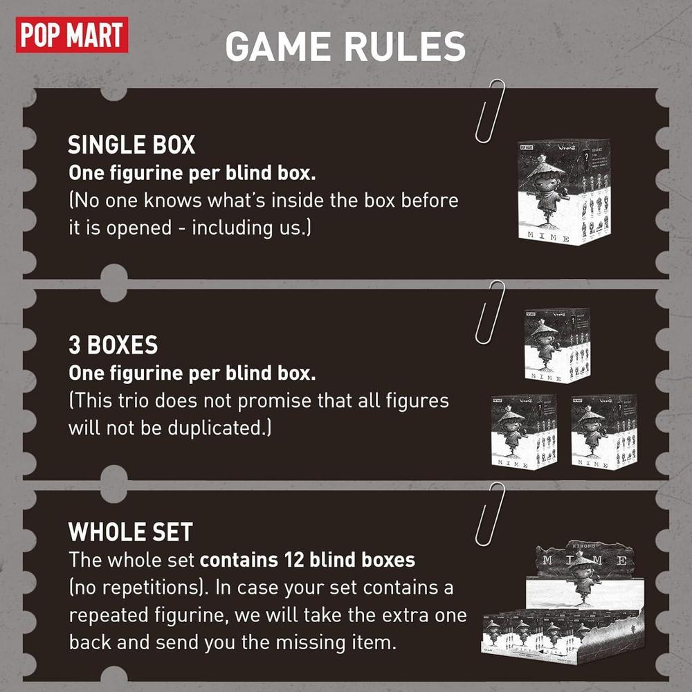 • POP MART Figuras de la serie Hirono Mime: La caja ciega contiene una figura aleatoria de una serie específica. Cada caja ciega solo contiene una figura. Nadie, incluidos nosotros, sabe lo que hay dentro. Esta colección contiene 12 figuras de caja ciega, una de ellas podría ser la edición secreta.