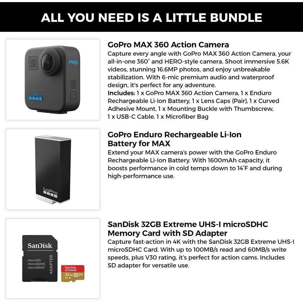 GoPro Cámara de acción MAX 360 con grabación de video 5.6K, estabilización HyperSmooth y PowerPano, con batería y microSDHC