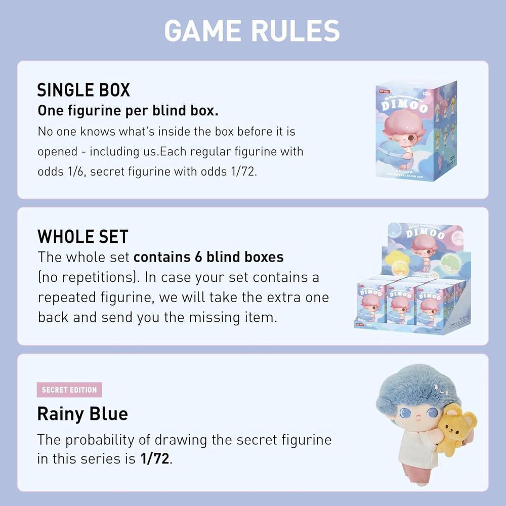 • POP MART DIMOO Mi Nube Compañera Serie-Cotton Doll Blind Box: La caja ciega contiene una figura aleatoria de una serie específica. Cada caja ciega solo contiene una figura. Nadie, incluidos nosotros, sabe lo que hay dentro. Esta colección contiene 6 figuras de caja ciega, una de ellas podría ser la edición secreta.