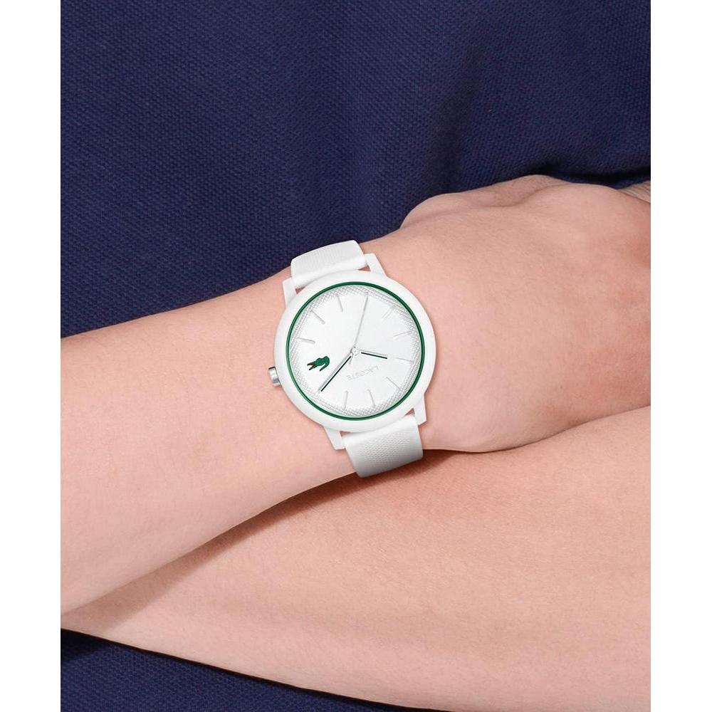 • Materiales de calidad: Lacoste.12.12 para hombre, caja de material compuesto TR90 y de color blanco, esfera blanca con índice y correa de silicona blanca.