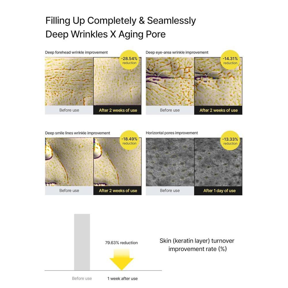 • Suero de retinol: Un ingrediente refinado de micropartículas, 16 veces más delgado que los poros (0.8 cm), está diseñado para penetrar directamente en los poros y mejorar la absorción de ingredientes activos. El retinol puro de vitamina A, no un derivado del retinol, es un ingrediente altamente eficaz que sobresale en la mejora de las arrugas y los poros causados por la pérdida de elasticidad de la piel. 9 péptidos funcionales diferentes trabajan juntos para mejorar la elasticidad, ayudando a mantener la piel suave y firme.