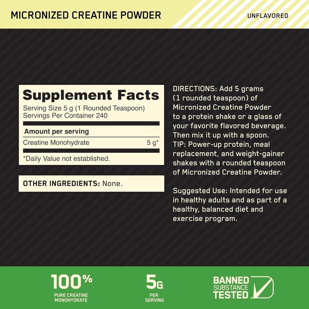 Optimum Nutrition Creatina Micronizada Monohidrato en Polvo sin Sabor, Amigable con Dieta Keto, 240 Porciones