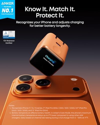 Anker Nano USB C Wall Charger, 45W Fast Charging Smart Display Charger, with 180° Foldable Plug, Smart Recognition,Built-in Care Mode,for iPhone 17/16,Apple Watch(Blue,Non-Battery,No Cable Included)