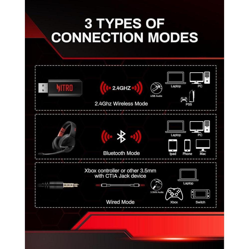 • Nuestros auriculares Bluetooth para juegos están equipados con un micrófono de alta fidelidad, lo que lo convierte en un auricular inalámbrico versátil con micrófono para todas tus necesidades de juego. Ya sea que seas un entusiasta de PC, un profesional de PlayStation que lo usa como auriculares para juegos para PS5 o un experto en Xbox, estás listo. La avanzada conectividad Bluetooth 5.3 y el robusto transmisor inalámbrico de 2.4 GHz garantizan una integración plug-and-play perfecta para la mejor experiencia de juego en todos tus dispositivos.