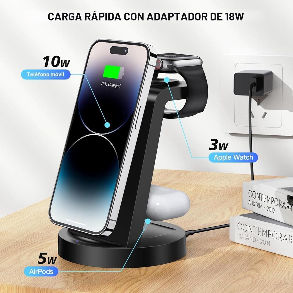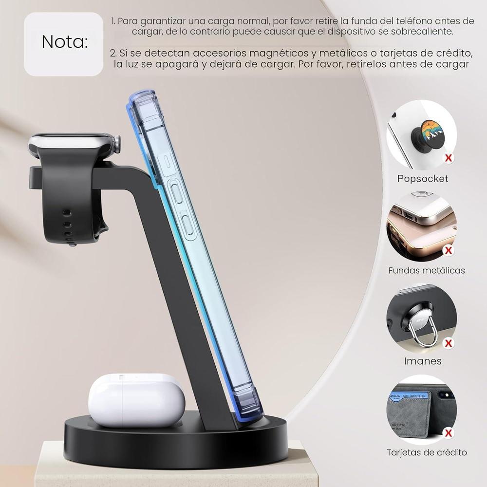 • Estación de carga inalámbrica 3 en 1: diseñada para usuarios de productos Apple, la carga inalámbrica te permite cargar el iPhone y Apple Watch y Airpods simultáneamente con un solo cable. Con una bobina de inducción de amplio rango integrada y tecnología de cargador inalámbrico, te ofrece una experiencia de carga fácil y conveniente sin la molestia de cables desordenados. Nota: Por favor, no use una funda más gruesa de 0.197 in (0,2 pulgadas/5,08 mm) y actualice el sistema del dispositivo rápidamente.