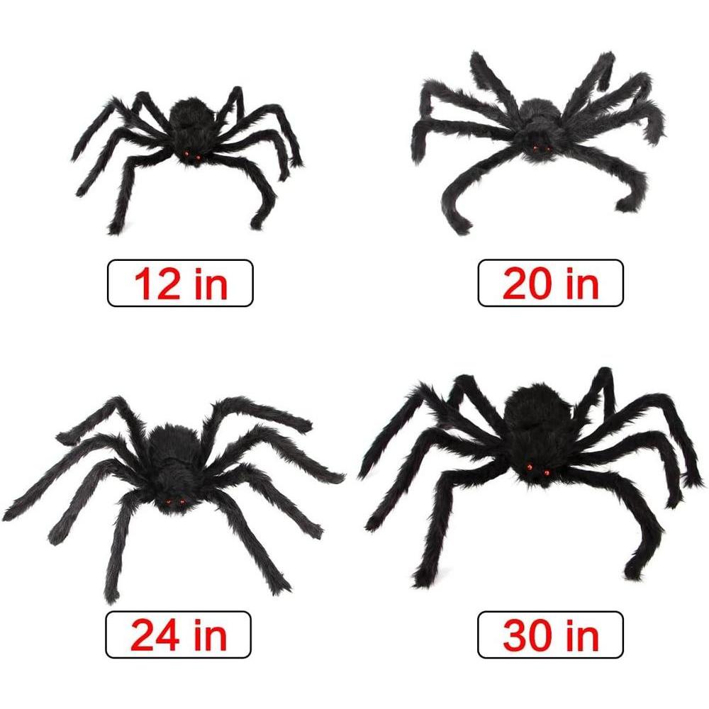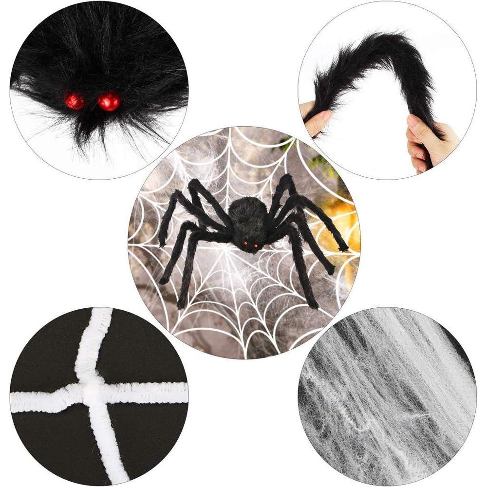 • Valioso juego de decoración de Halloween: viene con 4 arañas negras grandes (30 cm/24 pulgadas/20 pulgadas 12 pulgadas), 1 enorme telaraña redonda, telaraña elástica y 20 arañas pequeñas de plástico. Vamos a decorar tu loco Halloween.