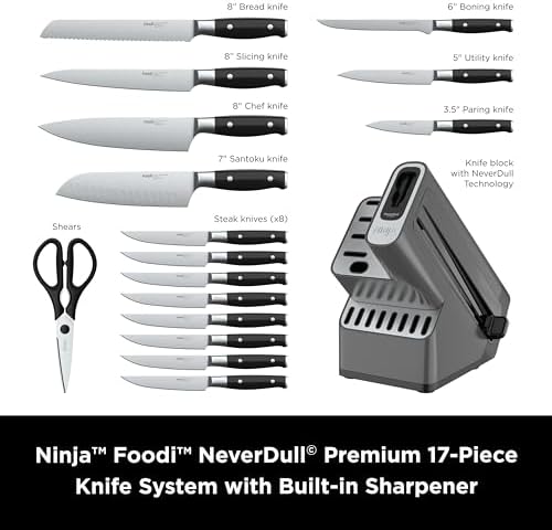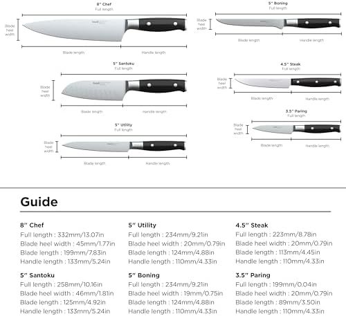 - Included components: 3.5" Paring knife, 4.5" Steak knives (x6), 5" Santoku knife, 5" Utility knife, 5” Boning knife, 8" Chef knife, 8” Bread knife, Knife Block with NeverDull Technology, Shears