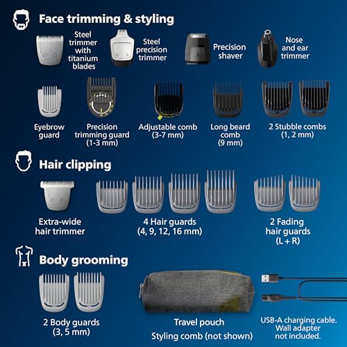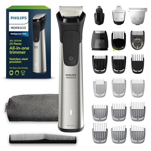 Philips Norelco Multigroom 7000 Series, All-in-One Trimmer, Beard Trimmer and Hair Clipper, 23-Piece Men's Grooming Kit for Beard, Face, Nose, Ear, Body, with Titanium Blades, Travel Pouch, MG7970/49