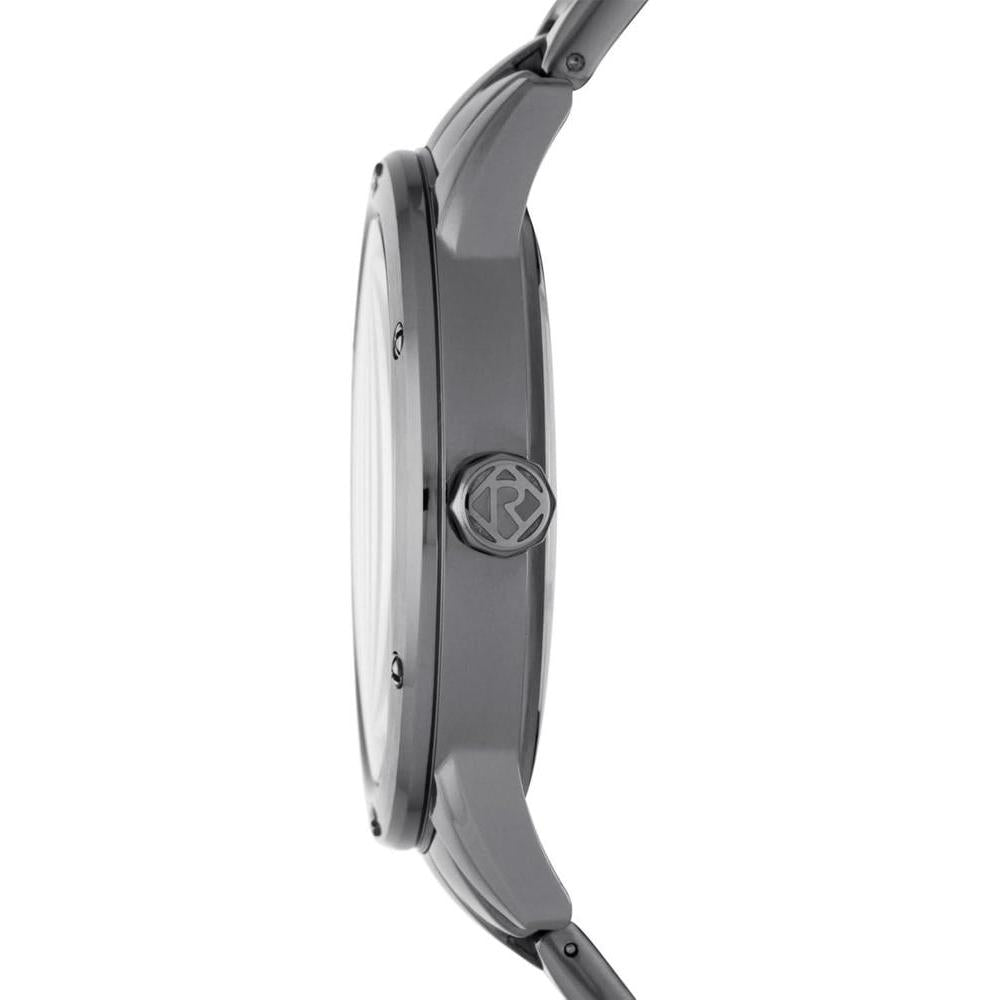 • Caja de acero inoxidable chapado en gris bronce y bisel atornillado; patrón de logotipo texturizado en la esfera y números romanos.