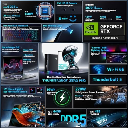 Thunderobot Zero 16 Pro Gaming Laptop, GeForce RTX 5070 Ti, Core Ultra 9 275HX, 16" QHD+ 360Hz Display, 32GB DDR5, 1TB SSD, Per-Key RGB, FHD IR Camera, Wi-Fi 6E, Win 11 Home