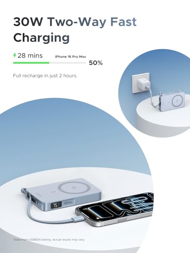 UGREEN MagFlow 10,000mAh Power Bank, Qi2 25W Certified Wireless Charging, Magnetic Portable Charger for MagSafe with Built-in Cable, 30W USB-C Battery Pack for iPhone 17 Pro Max/16/15/14/13/12