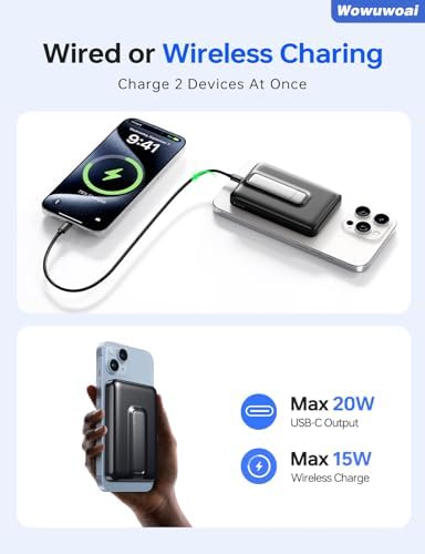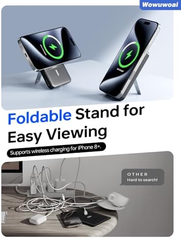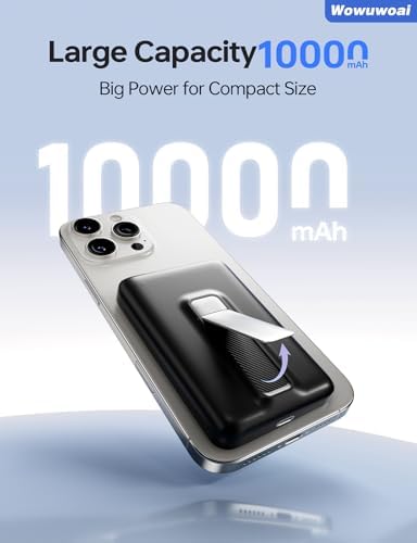 Wowuwoai for Magsafe Portable Charger, 10000mAh Wireless Power Bank with Stand, USB C PD 20W Fast Charging Powerbank, Magnetic Battery Pack Compatible for iPhone 17/16/15/14/13/12 Series - Black